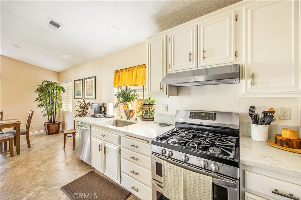 Massive View of the Golf course and mountains! Single story home right on the golf course in the Menifee Lakes Community. Let the outdoors in and expand your entertaining area with dual sliding doors that showcase the newer patio cover with recessed lighting. Your favorite spot will be relaxing on this patio that spans the backyard. Serene & picturesque! Low HOA monthly dues and optional golf memberships available. Some of the HOA amenities include a community beach style pool, lake, walk & bike paths, fishing, BBQ's, picnic areas and more. Some nice contemporary upgrades in this open floor plan. Travertine flooring throughout all the living areas and carpet in the bedrooms. Upgraded and updated lighting fixtures and recessed lighting added. Kitchen features Quartz countertops, white cabinets, and stainless steel appliances. Light and airy neutral paint throughout. An open and inviting floorplan welcomes all into this well-cared for home that you will be sure to want to make it yours. Just the perfect size home with minimal maintenance yard. Schedule your showing to see today!